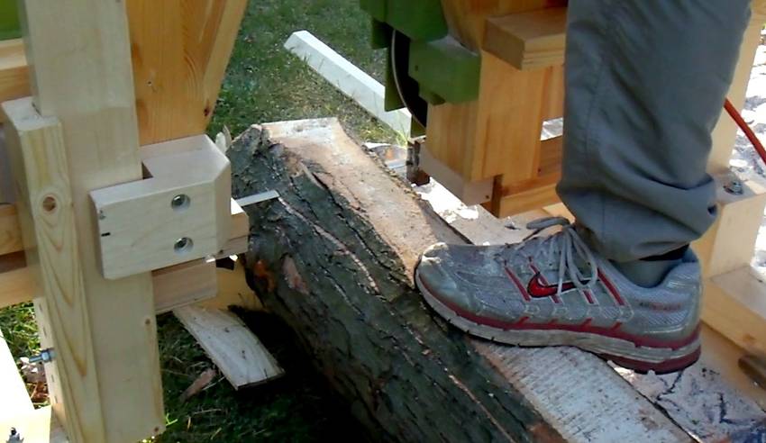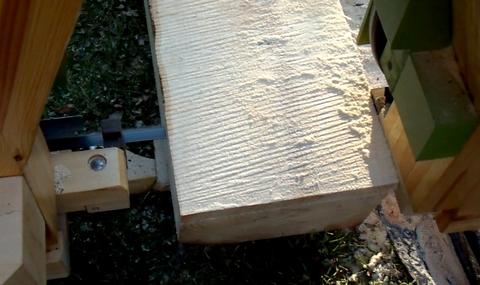 The log in this picture is a bit smaller than the previous one I cut, so I put my log cradles at an angle to grip the log a bit better. It's a bit of a wobbly arrangement, but I didn't think it was worth making new cradles for just one log.