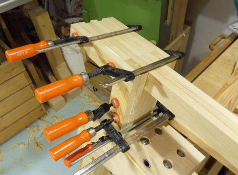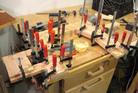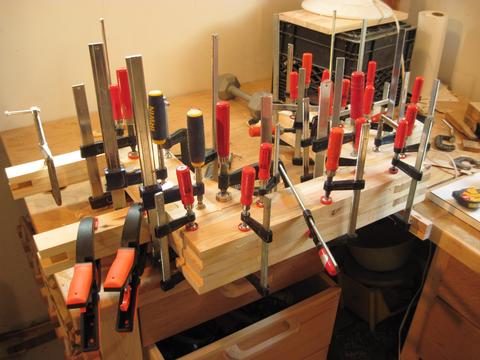 Gluing up the second last layer. It helps to have lots of clamps. If you don't have quite as many