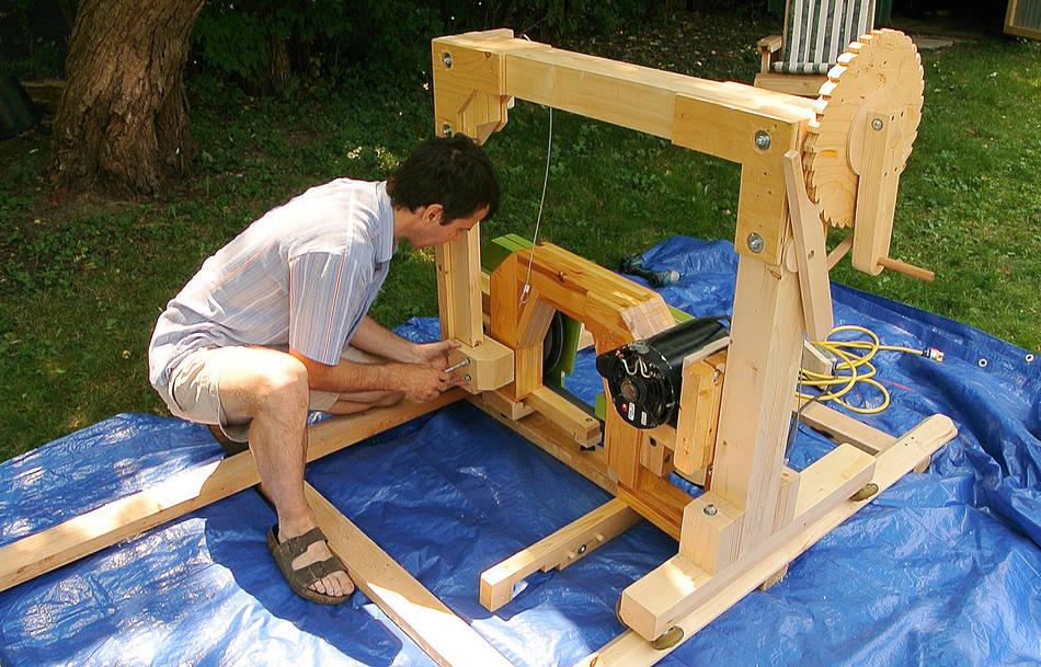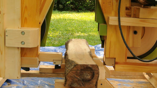 I never intended this mill to be used with coniferous trees. Coniferous trees are dry and sappy, so some sort of detergent soap drip system is usually employed to keep the blade from gumming up and keep it cool. But my mill is made of wood, with MDF wheels. So I'm not keen on getting it wet.