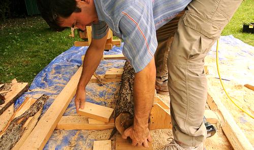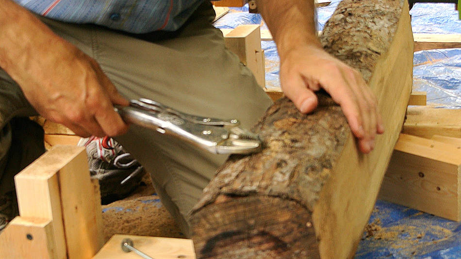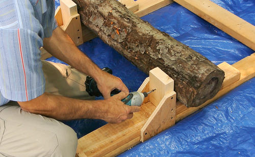 Another log, stacking blocks under it. Once the log has two flat sides, gravity is enough to