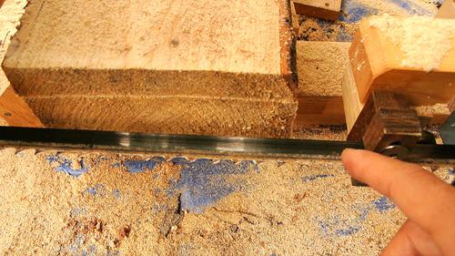 I experimented with tilting the first blade guide downwards a bit by putting shim in it,