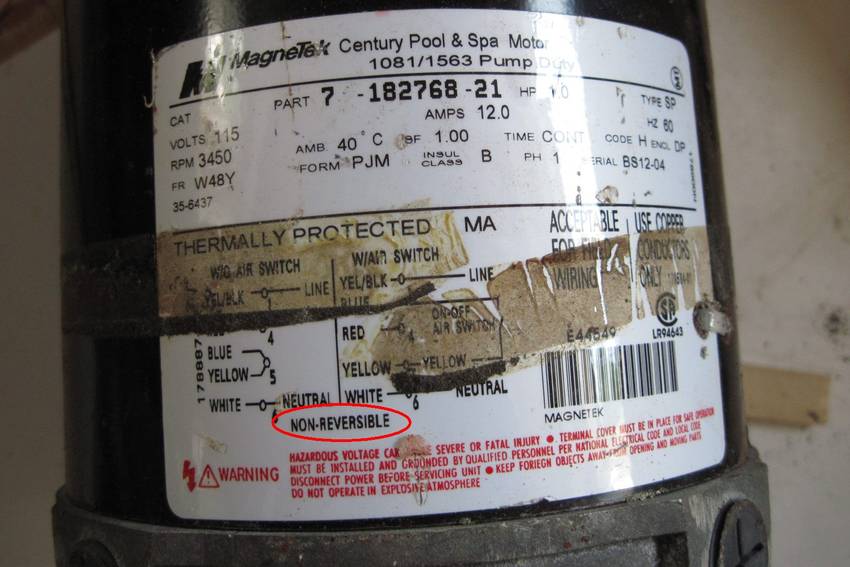 Less ideal is that it's a 3450 RPM motor (instead of 1750), so I need quite a bit of reduction. It also turned in the wrong direction and the label indicates that it's "non reversible". But reversing AC motors is just a matter of reversing the polarity of the starter winding (which is in series with the centrifugal switch). I was able to reverse this one by bringing a separate wire out from the windigns to the switch.