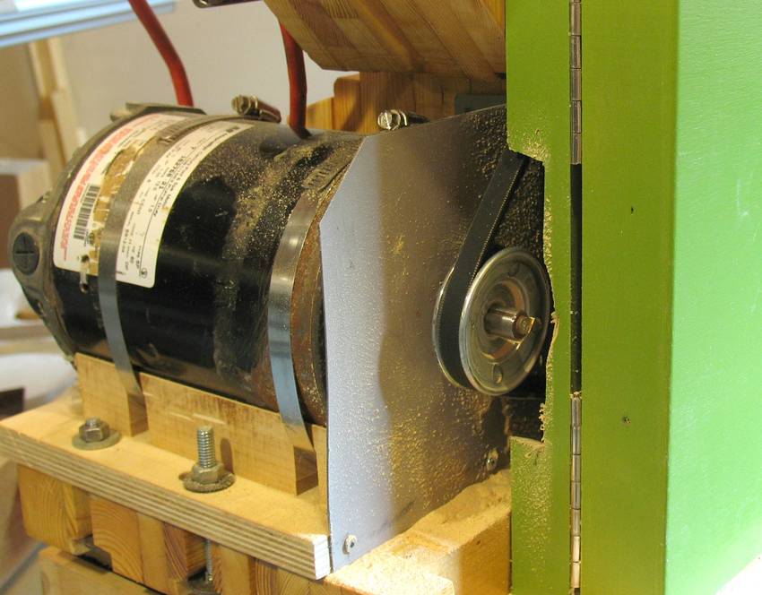 I also installed a piece of sheet metal between the motor and the pulley. The motor is an open framed motor that pulls air in from the front, and the sheet metal ensures that the motor doesn't suck in the dusty air from inside the enclosure. There is a gap between the sheet metal and the motor to allow the motor to still pull air in from the front.