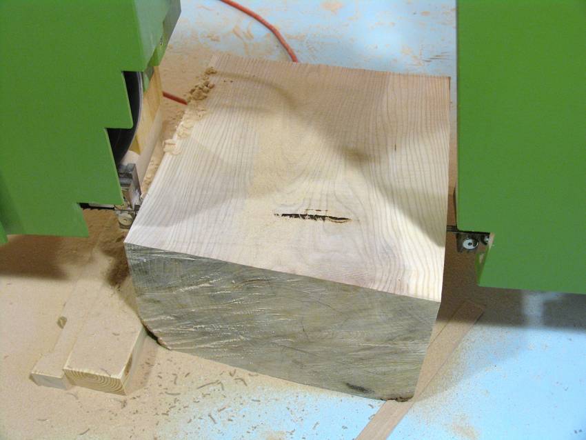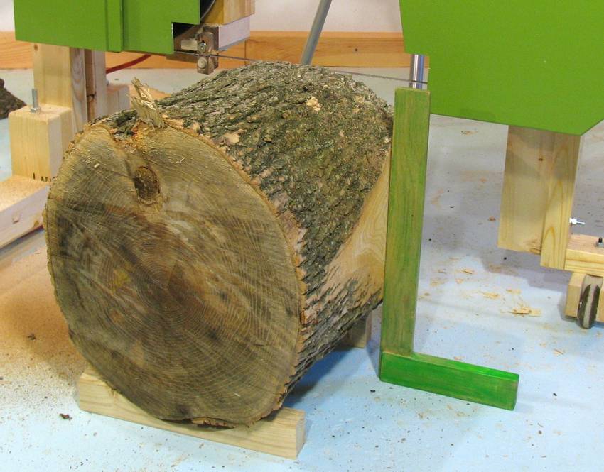 My saw only opens up to 35 cm (14") wide, but that should be enough to cut slabs off the log. After slabs are cut off, the rest of the log will fit between the blade guides.