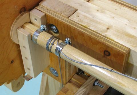 Hose clamps worked out well for holding the cable (or the strand) in place. I make sure there are at least two turns of the cable around the dowel even when the saw is in its lowest position. The friction of the cable around the dowel means that, after two turns, the hose clamp only needs a minimal amount of hold to keep the cable from slipping.