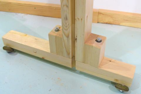 as shown here. The wheels are roller blade wheels, rolling on a 2x4 that