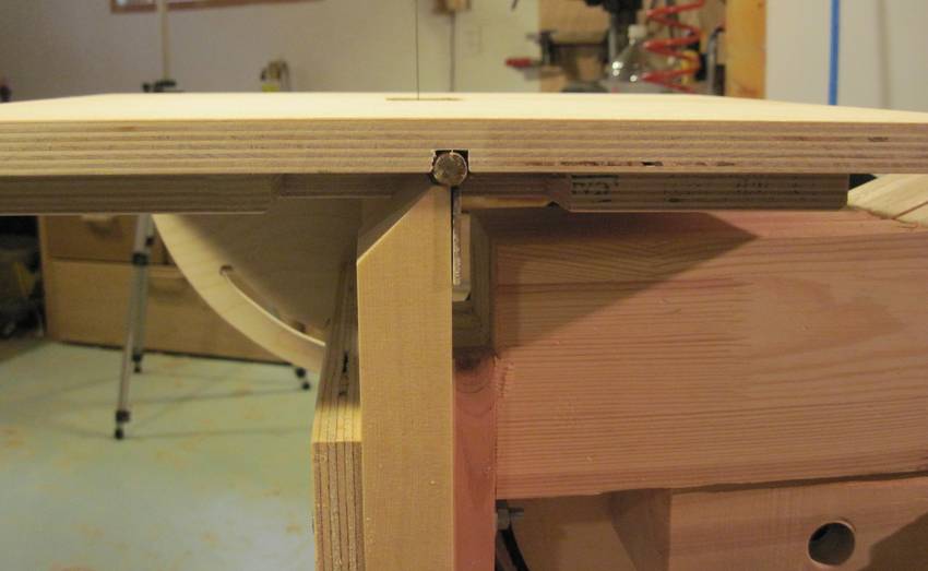 The main disadvantage of hinges is that the top of the table surface will move side to side with respect to the blade as it's tilted.