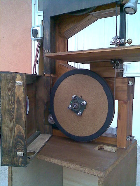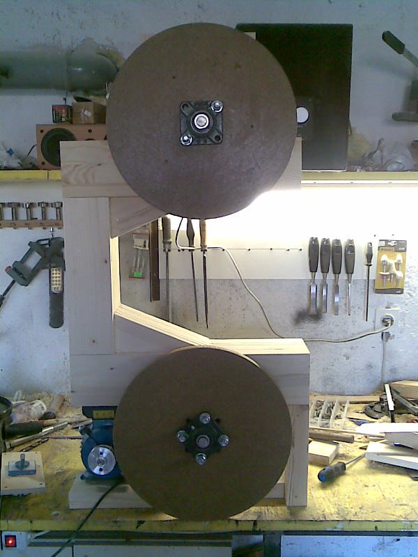 Be sure to make sure those bolts are tight. You might have to slightly tighten them with changes in humidity. I had my bearing flanges develop a slight pop every half turn as the wheel was spun slowly, so I knew they were coming loose. But I didn't bolt them as well either. This is why I replaced the metal flanges with wooden ones on my first bandsaw and started with wooden flanges on my second one