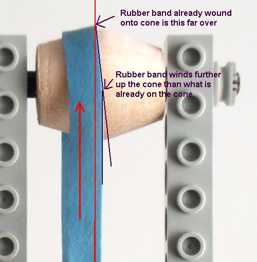 The higher section of the crowned pulley puts more tension on the rubber band than the narrower edges. As a result, the rubber band flexes into a slight arch towards the middle. As the rubber band winds onto the pulley, this arch causes the band to always wind further up on the conical section than what was previously wound on. The higher point on the pulley always creates more tension in the belt and causes it to arch in that direction.