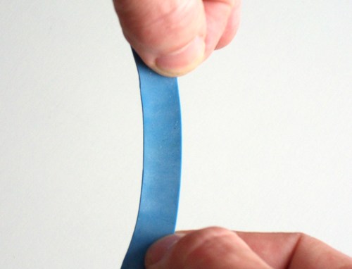 I'm pulling the rubber band in the photo on just the right edge. With more tension on the right side, that side stretches more, and the rubber band forms a slight arch. In an actual belt, this stretch is too subtle to be seen just by looking at it.