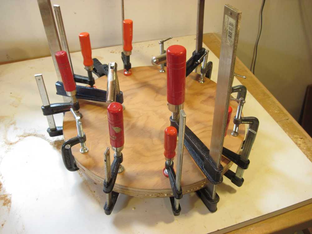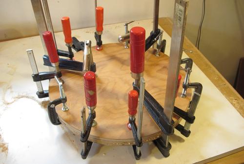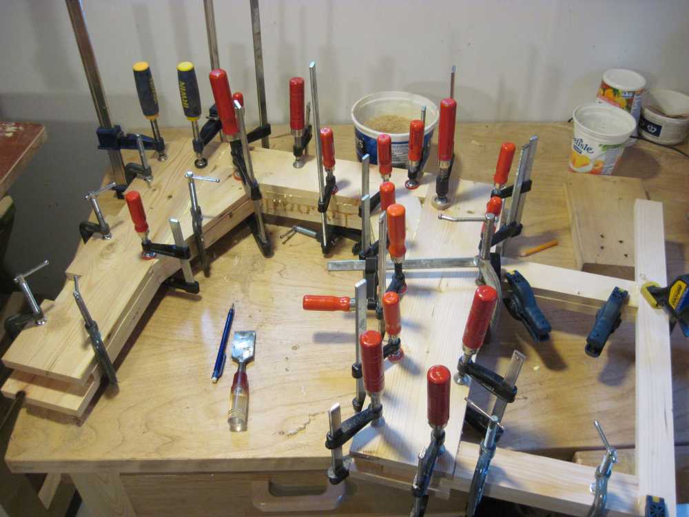 I ended up using all of my small clamps every time I glued up a layer. Building up the frame extended over the course of a day and a half, as I'd always go and do something else between layers.