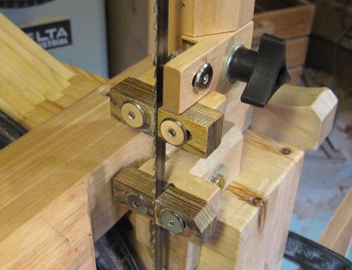 I was originally going to use Lignum Vitae, the hardest of the hardwoods, for the guide blocks. But then I went through my box of exotic off cuts that I bought for this article and tried rubbing each one on my cast iron table saw table to see how slippery they were. The bocote slid the easiest, so I used that. But you don't need to get bocote. Any hardwood will do, the heavier the better. I'm still using the original oil soaked maple guide blocks on my other bandsaw.