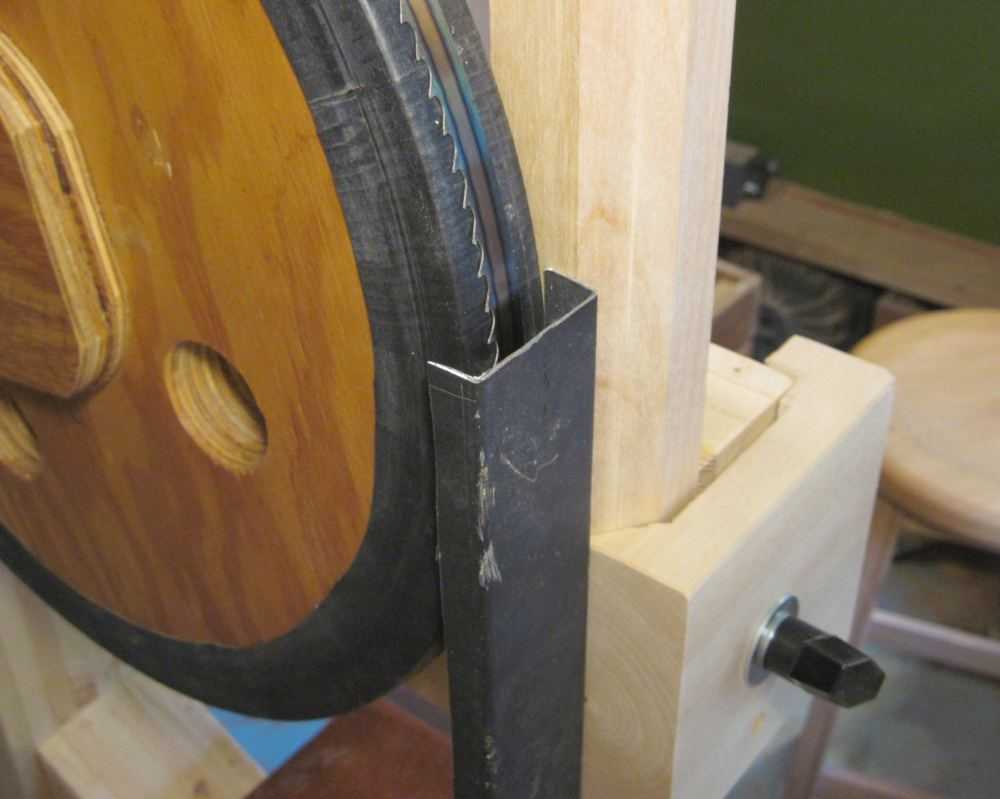 Because of space constraints, the blade guard above the top blade guide is made out of sheet metal.