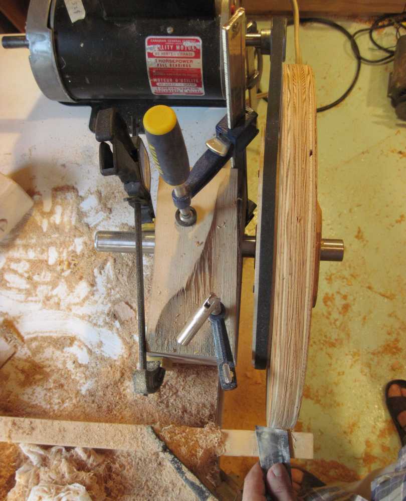 With the wheel turning on its own bearings, any eccentricity I had with how I mounted them got cut away as I turned the wheel down to its final size. I did encounter a few voids in the plywood that I had to fill, but I didn't bother filling small voids near the edges. But the middle of the wheel, where the blade normally runs, has to be solid.