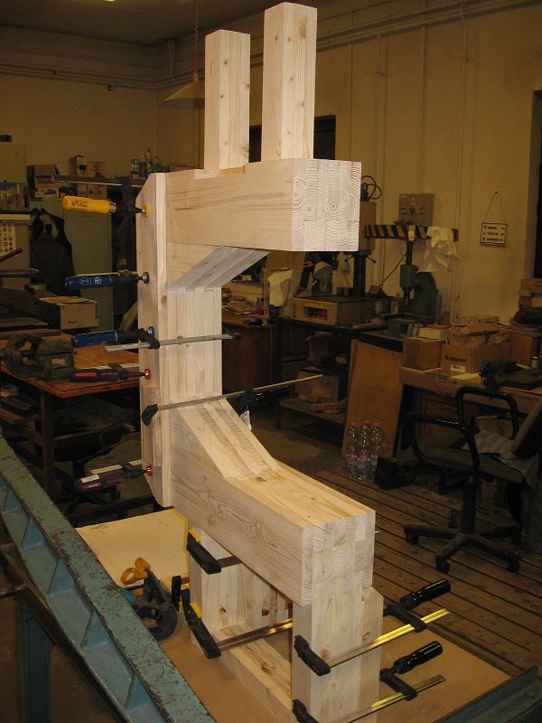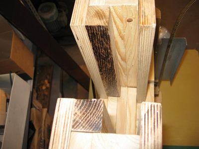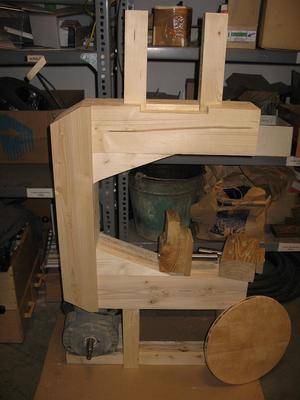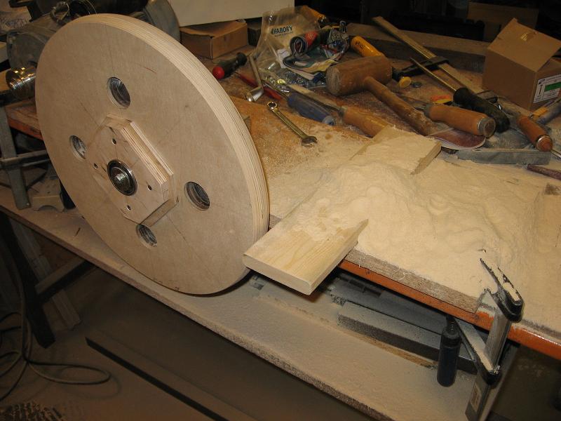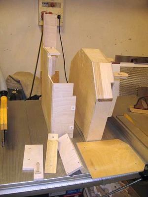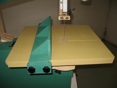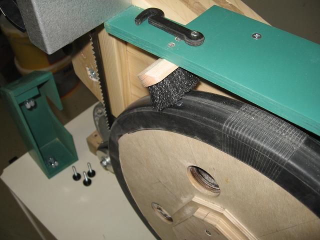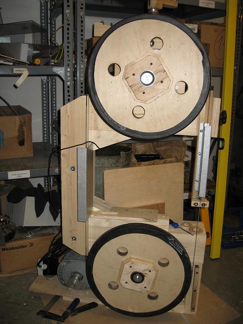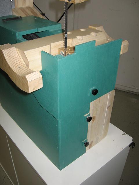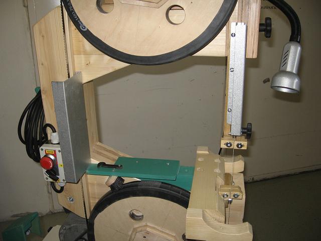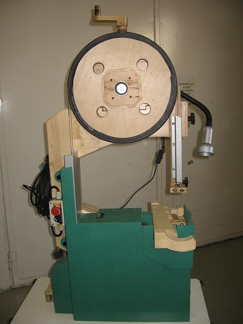 Tamás Peto I used different types of wood for the bandsaw. The frame is made of pine, the guide and the wheel mounts are made of acacia, and I used plywood as well. Since the right top post of frame got warped, I couldn't apply the wheel mount frame in your plan, so I had to create an other one, that I screwed on to the posts. On the bottom of wheel mount I fixed another piece of hardwood in order to keep the wheel firm together with the other clamp bolt. I modified the enclosure of the bandsaw too: mine is entirely made of plywood, with a piece of sheet metal for the blade cover. There are separate frames for both the top and bottom enclosure with attachment lugs. Nevertheless, they are not as easily removable as yours, except the belt cover, which I equipped with a door latch.