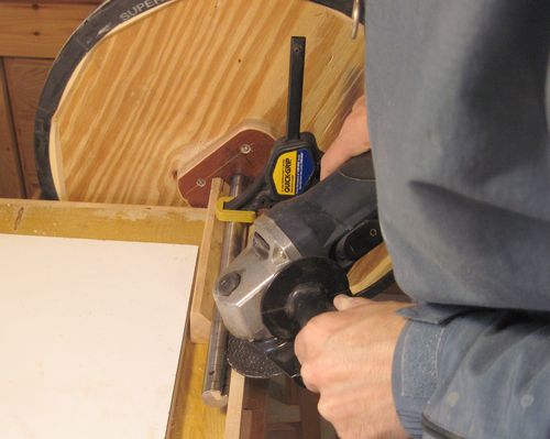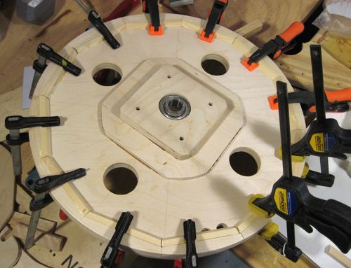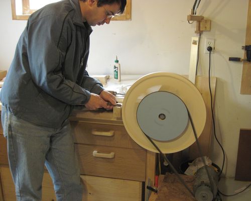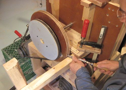 I had previously trued the upper wheel by mounting it on my extra long drive shaft of the bandsaw and spinning it up that way. But I had since shortened this shaft to its final length. So I made a temporary pulley, and attached it to the upper wheel with a pair of wood screws. This was enough to spin up the upper wheel on my workbench. Using some chisels on the wheels, in a lathe-like fashion, I turned it to run true again. When I checked the wheel with a dial indicator, it was within a range of 0.002" (.05 mm) all the way around.