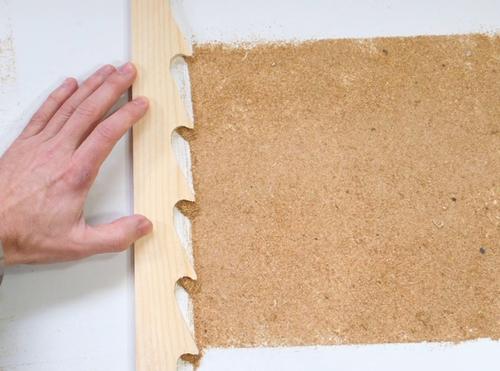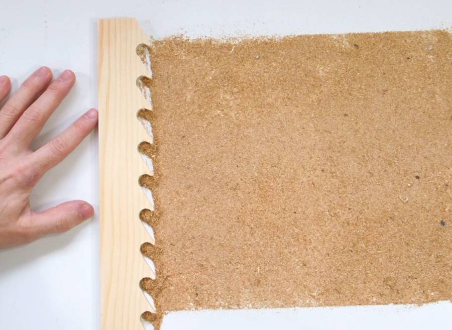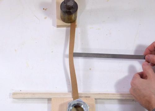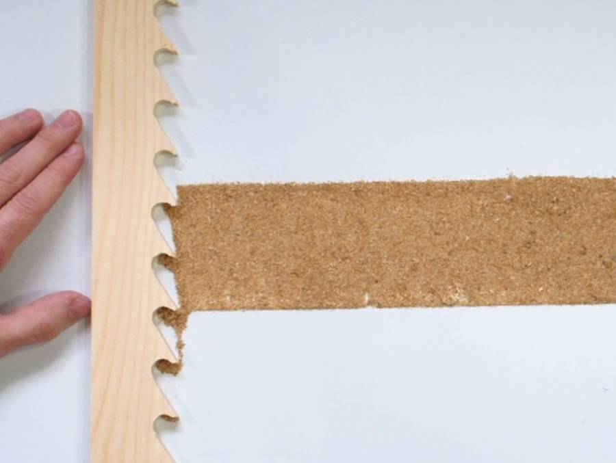 To illustrate some of the concepts, I made a simple "model" of a bandsaw blade cutting through wood. I used sawdust on the table to model the board being cut. Each tooth, as it passes through the board, cuts out some wood chips, and carries them out of the cut.