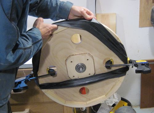 To get the tube around the wheel, I hooked it over the rim and clamped it in place with a clamp. I then took the center of the remaining free loop and clamped that to the opposite edge with another clamp. With the tube clamped on two sides, I only had to worry about stretching it over half the rim at a time. It also made it easier to ensure that I'd tensioned the tube evenly all around.