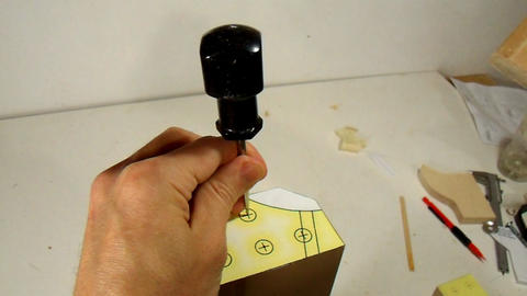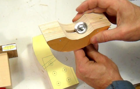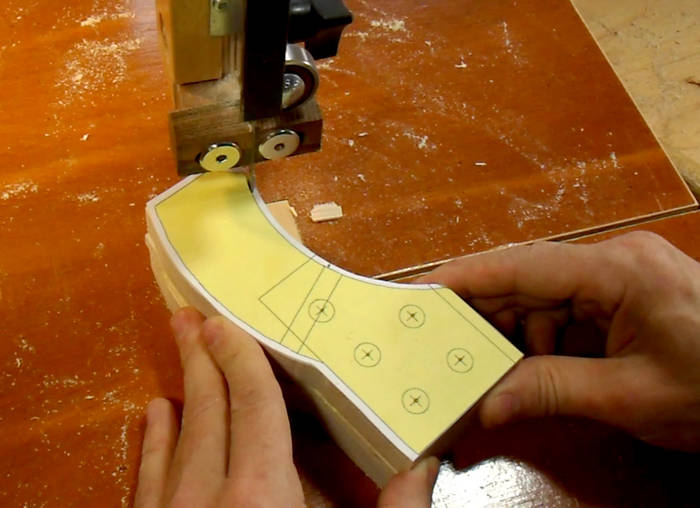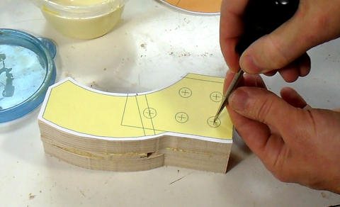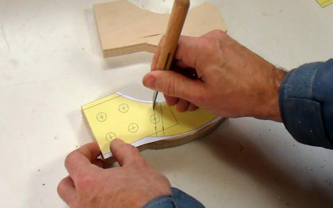 Next I use an awl to punch through the centers of the dowel positions. I'll drill these out later, but I'm punching them now just in case I mess up the template. Drilling must be done last, because the drill may catch the template and pull it off the wood.
