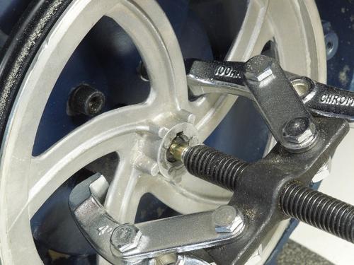 The two pronged gear puller wasn't ideal with the five spoked wheel. A three pronged gear puller would probably have been better.