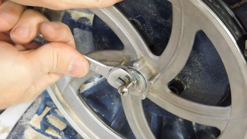 The wheel is press fit onto the shaft, so it takes quite a bit of force to get it off and on.