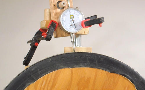 Here I'm measuring wobble of the wheel by measuring against the blade. I had a total variation of .005" (including variations added by the blade and tire), which I figured was reasonable.