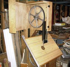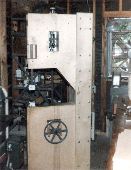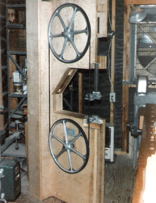 "I actually designed and built this back in the 1980's in collaboration with the founder of Gilliom Mfg. He furnished me a parts kit and I worked out a design for the saw. He was to help me get an article about it published in Fine Woodworking Magazine, but he passed away in '86 or '87, and then the magazine published a different design by someone else. Also, that was the time when the country was being flooded with inexpensive machines from Asia, so there was no longer much interest in homemade machinery. In the late 80's one could buy an Asian made 18 inch bandsaw for about the cost of the parts and materials I had in mine. Grizzly was one such source."
