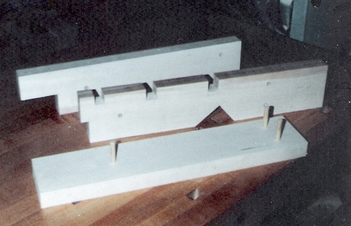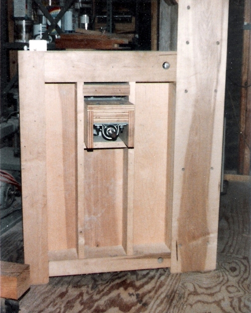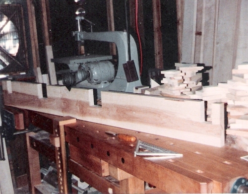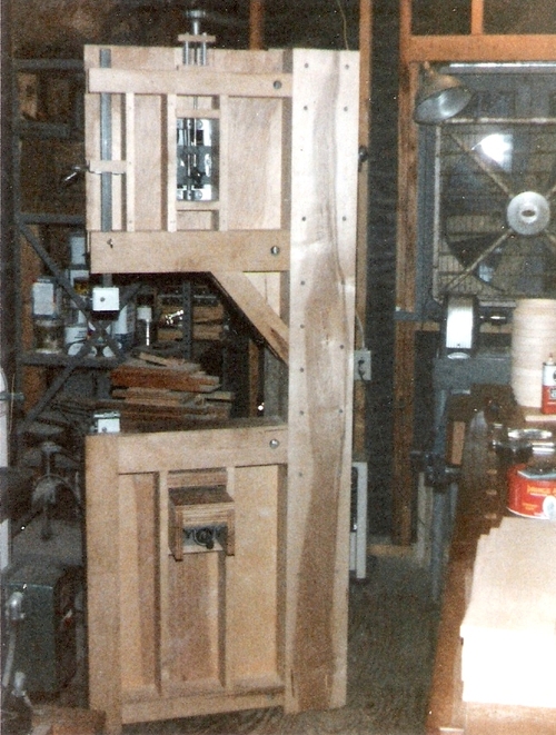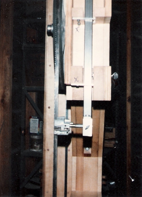 "I built my first Gilliom bandsaw in 1974 using their basic design with a bit of re-enforcing and better cabinet making techniques. Their design didn't even call for glue! I had almost no experience with bandsaws at the time, so I had no idea what to expect from one. I found their frame to be rather flimsy and the saw to be somewhat frustrating. I sold it a few years later for the cost of the motor in it, along with my other tools (long story,) but I always daydreamed of building another with a much stronger frame. Eventually I got my wish. I still have this second saw, the one in the photos. I never completely finished it, but I did complete it to the point where I could resaw with it. I once sawed a large, green pecan log with it; I had pieces on the table as large as 7 x 13 inches by 5 feet long and weighing nearly 200 pounds. Naturally I had some auxiliary bracing under the table to help support the weight. I have a 1 1/2 horsepower, 1725 rpm motor on the saw running at 230 volts. The switch is from an old bench grinder and is rated high enough. I run the saw at approximately 3000 blade feet per minute and have never bogged the motor down. The wheels will take an eleven foot long blade up to one inch wide, but I generally used to keep a 1/2 inch blade on it. A 3/4 inch blade would be optimum"