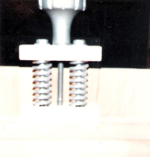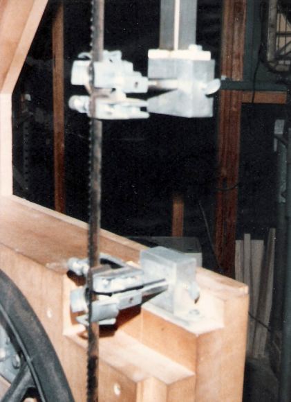 "The blade tension springs are the older style used in Rockwell/Delta's 14 inch saw. They aren't really very good - don't return to their full height, but they are the best I could find at the time. Together they exert about 400 pounds of force on the blade, which is about 250 pounds short of what I would like for a 1 inch blade; 650 pounds would give me about 10,000 to 12,000 psi on a 1 inch blade. I plan to replace them with stronger springs. which is why I want stronger shafting and bearings - and why I may need stronger wheels." Jim later elaborated: "I should add that they don't come with a Gilliom parts kit. While I'm not really satisfied with them, they are perfectly adequate for tensioning up to a 1/2 inch blade, which will do most the work one would ever want to do with the saw. They do reasonably okay on a 3/4 inch blade, too. It's only when using a 1 inch blade that their limitations become evident. A 1 inch blade will run on the machine and do a good job of sawing even at less than the optimum amount of tension recommended for such a blade, but the springs suffer for it. I believe I read somewhere several years ago that Delta and Jet have upgraded their OEM springs for their 14 inch saws, so their present ones would probably be fine."