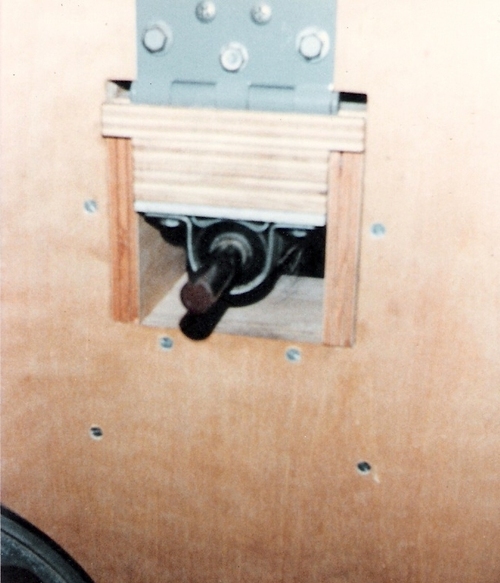 "I used a hinge on the lower wheel bearing mount as a concession to Mr. Gilliom. He was of the opinion that the lower wheel of a bandsaw should be tilted a degree or two off vertical to counter the upward pull of blade tension and the force of pulling a blade through wood being sawn; his own saw design allowed for this and out of politeness I didn't tell him that it needed that because it just wasn't rigid enough. :-) For my part I wasn't sure one way or the other. I had noticed that the lower wheel seemed tilted in a number of manufactured saws that I had had experience with, but I didn't know if that was by intent; I had never seen a saw that had any means of making such an adjustment either, although some do allow to move the shaft sideways. I bored some additional screw holes in the hinge leaf which attaches to the frame and ran in some long, hex-head lag screws - 2 1/2 or 3 inches. Not visible in the photos, but inside the motor cabinet, are a couple of vertical studs attached to the panel on the back of the frame, on either side of the bearing mount, which give support to the rear of the drive."