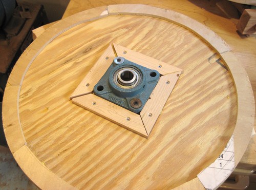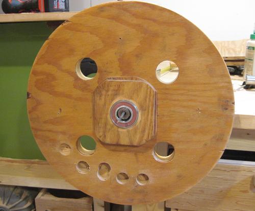 and mounted them on either side of the plywood wheel. These flange bearings would