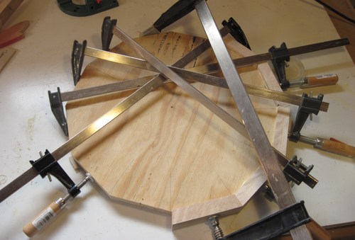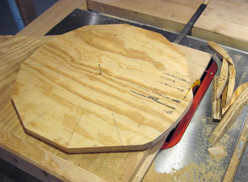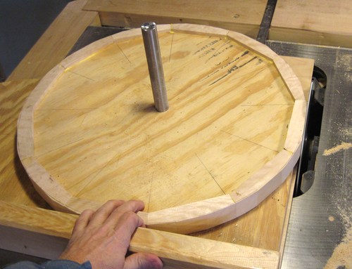 I cut my wheel blank to be a 12-sided polygon. I used a nail in the pilot hole as a