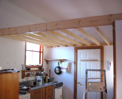 I decided to build a platform above the kitchen end of the apartment, with the top of the platform at a height of 7 ' (2.1 meters). This still gave her about 3' 6" (105 cm) of height for he loft, enough to sit up. But also leaving enough height below so that there was no risk of bumping one's head against it.