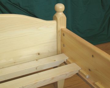 This being a "proper" wooden bed, it has bed rails on the sides of the mattress. I attached these using bed rail hooks, so the whole bed can be taken apart easily. I bought these at The Home Depot. The Home Depot calls them "bed rail clips", but you will have more success on the internet searching for "bed rail hooks". Last time I checked, The Home Depot only carried the 4" bed rail hooks, which would be too small for this bed. You can however get these from Rockler.com. To help hold the screws in the end grain, I put some dowels through the bed rail so that the screws holding the bed rail clips actually have some cross-grain hardwood to thread into for a better grip. These are blind holes, so they can only be seen from the mattress side when the bed is assembled - see image at right.