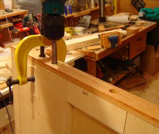 To get the dowel holes aligned precisely, I had the idea of making a drill guilde out of a piece of hardwood, and just drilling through that to get repeatable hole alignment.