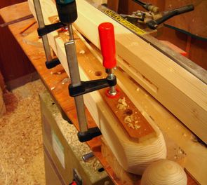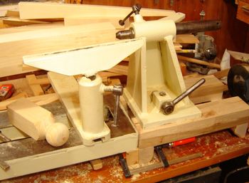 For the tops of the posts, I decided on a ball shaped top. I wanted this to be an integral part of the posts, so this required turning the whole posts on my lathe. Now, my lathe is quite big and heavy, but the lathe was not quite long enough to mount the posts for the headboard side of the bed. It is however very low tech, so it was relatively easy to build an extension for the tail stock of it out of wood.