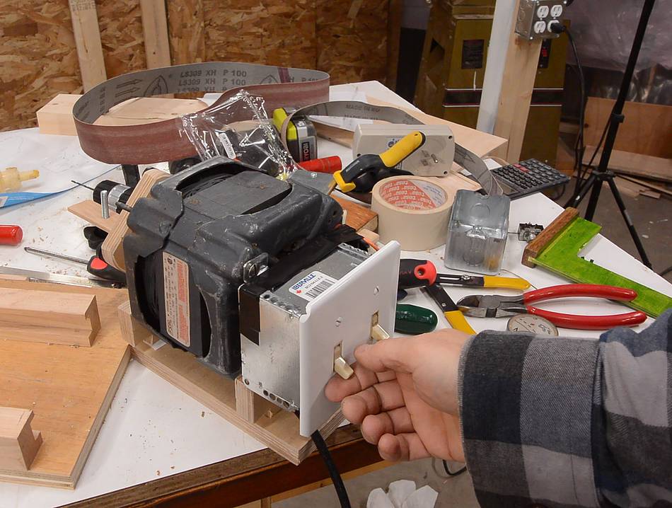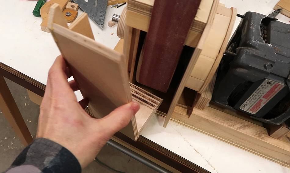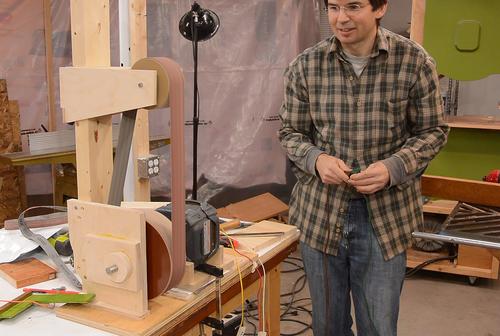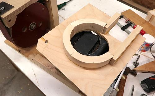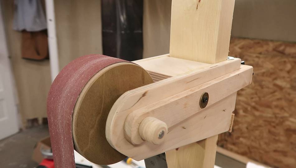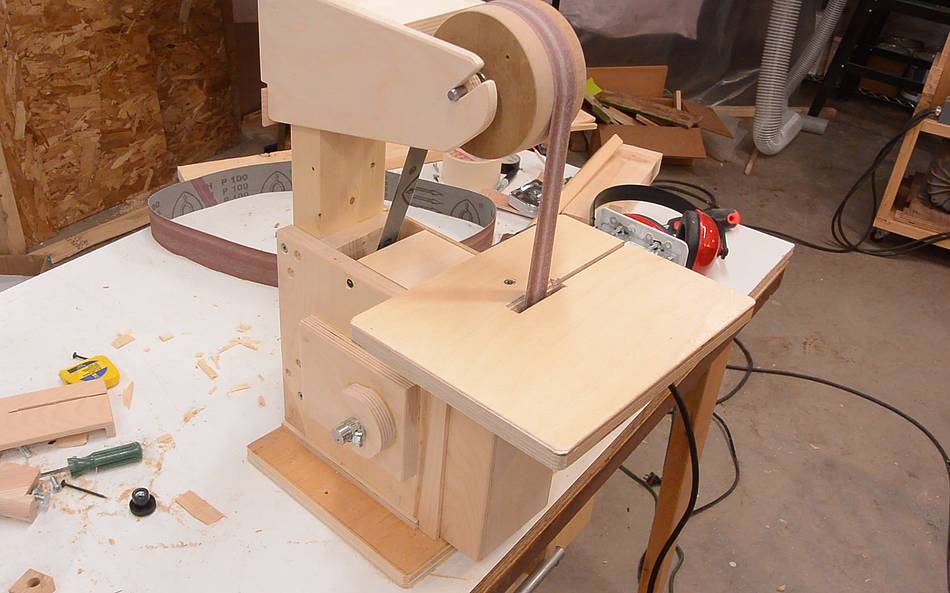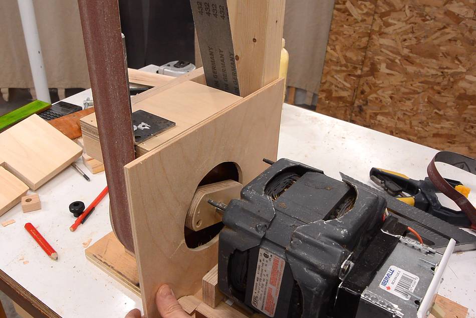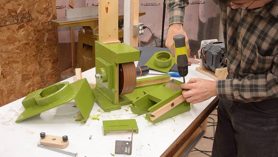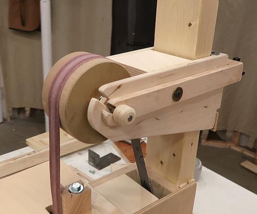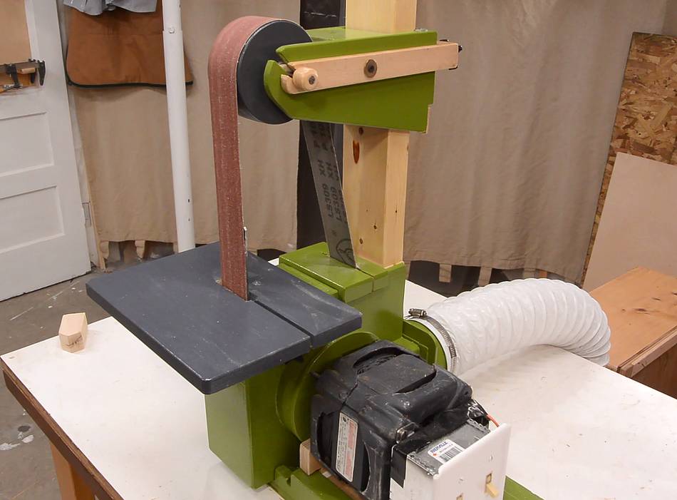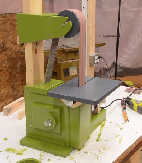 As a belt grinder, it's not as good as normal belt grinders, but it was easier to build and doesn't take up much workbench space. It wouldn't be smart to use a belt grinder all enclosed in wood, so I don't use the enclosure. And the metal dust doesn't stick to the belt like wood dust does, so the lower wheel being bigger isn't an issue as a belt grinder.