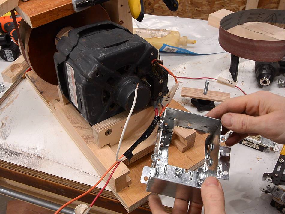 I briefly considered putting the motor behind the sander, with two pulleys. This would allow me to change the speed, but would also mean removing the drive belt to remove the sanding belt.