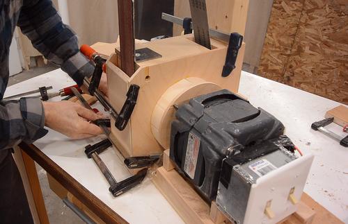 I cut a proper table and mounting bracket out of Baltic birch plywood, then clamped those two together and checked the fit to make sure the mounting bracket was in the right place.