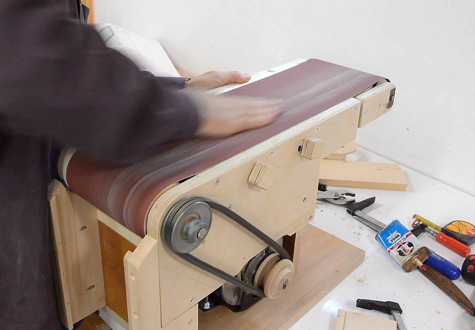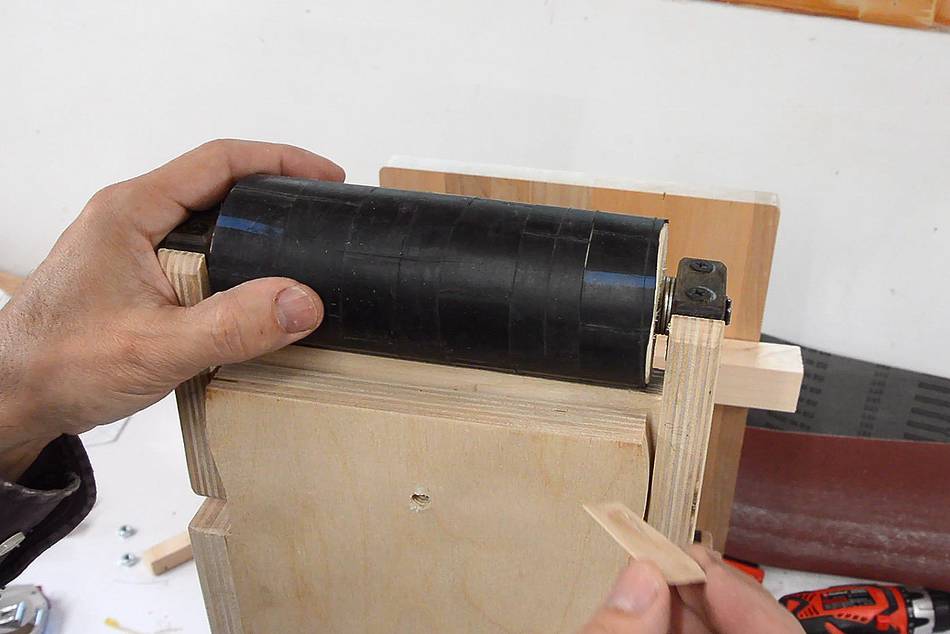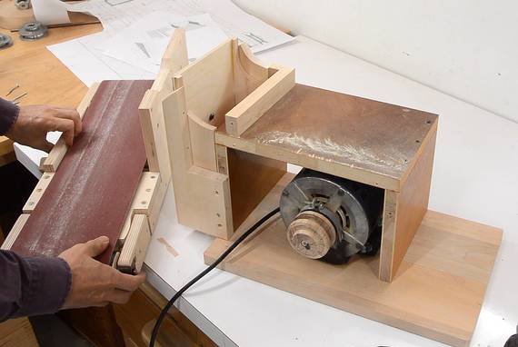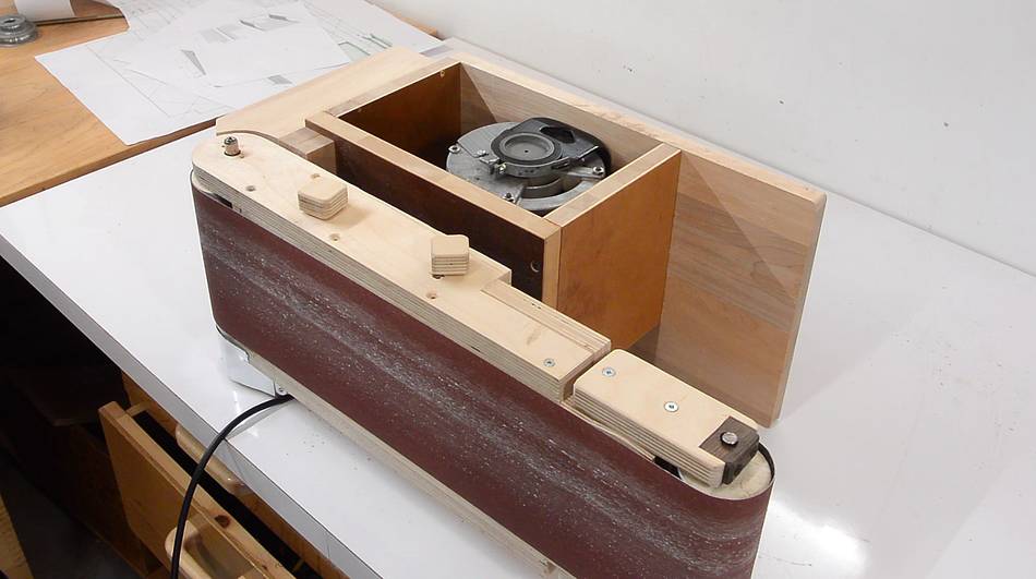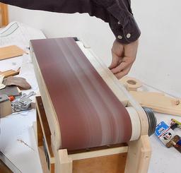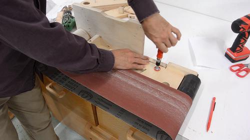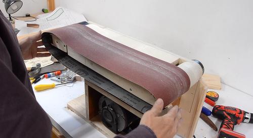 Then, with the new bracket in place, I slid a sanding belt half-way on the