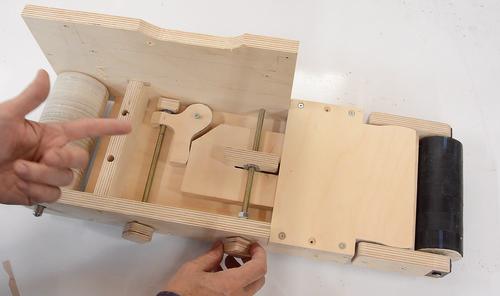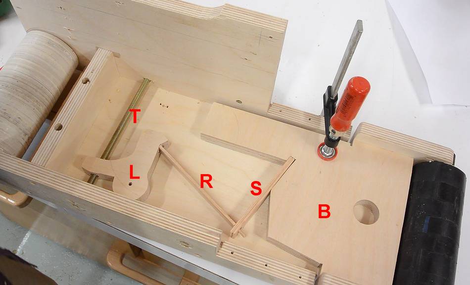 At left, you can see how the new tensioner mechanism works. Tension screw 'T' pulls on lever 'L' turning it clockwise, which pushes the push rod 'R' against the wooden spring 'S', which is connected to the idler bracket 'B'.
