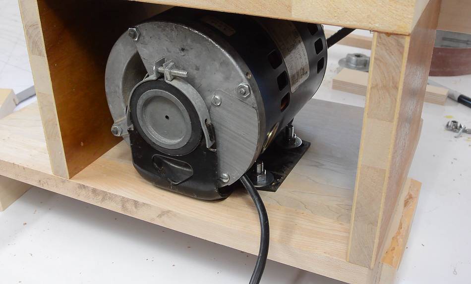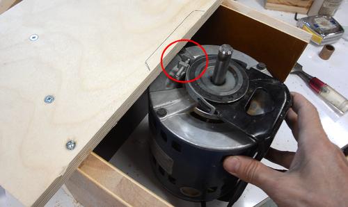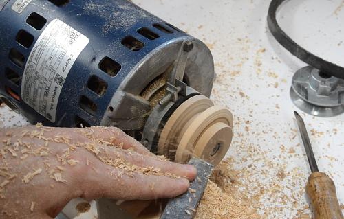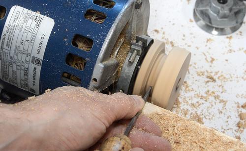 I drilled the hole 31/64" in diameter, a bit smaller than the motor's 1/2" shaft. I then drove a nail in where the motor's flat spot is to act as a key to keep the pulley from spinning loose.