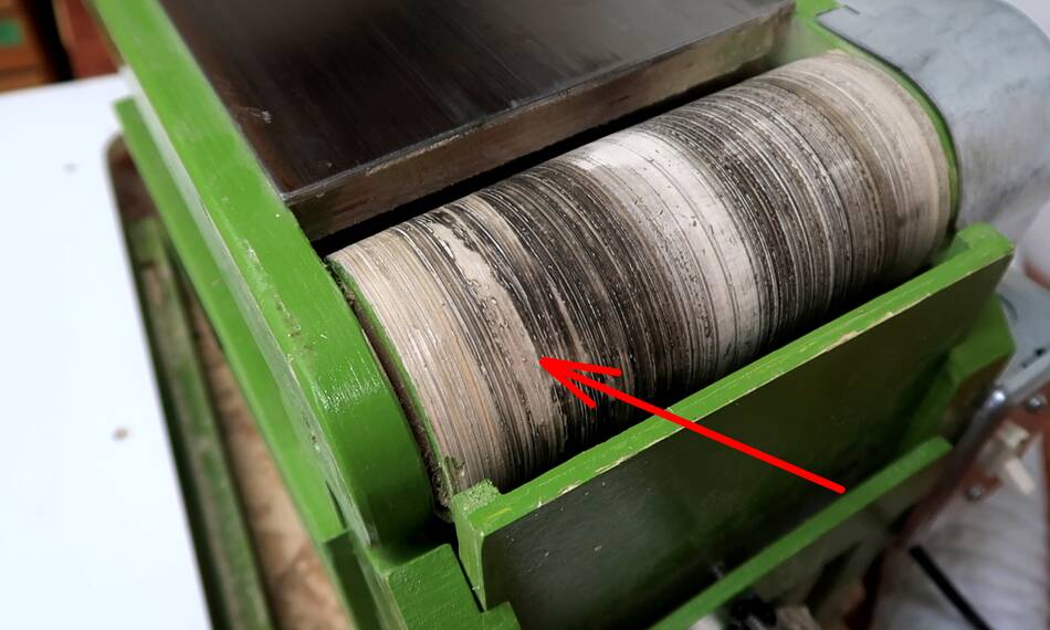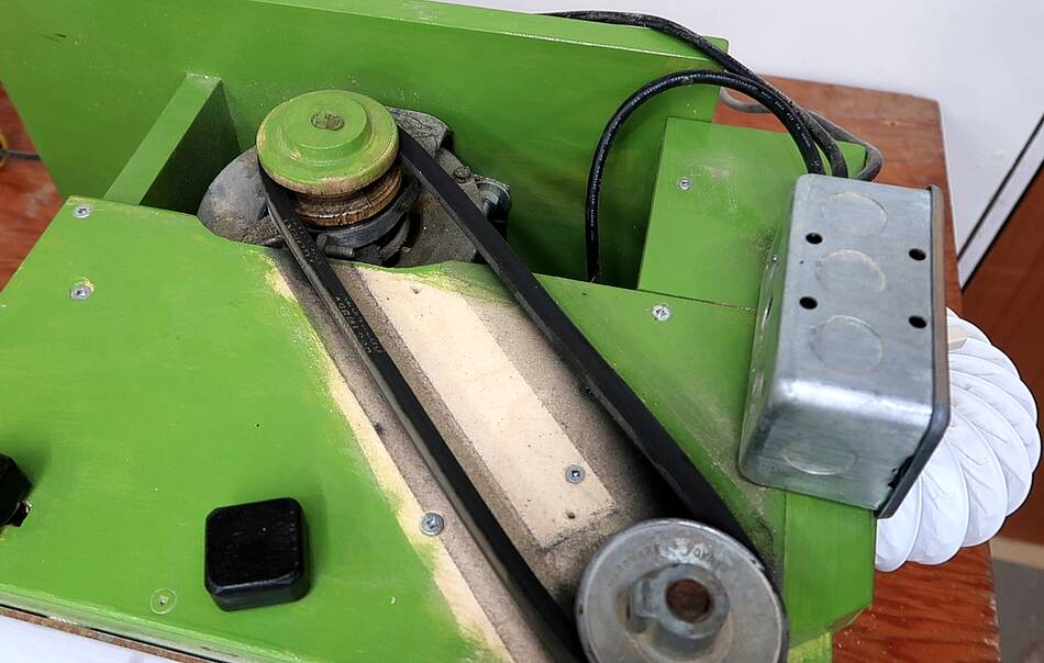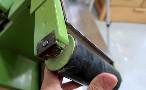 But inspecting it now, there's a small patch that came off. This part is at the level I usually have the table at when I do edge belt sanding, and sanding inside curves is always against the roller. So this part gets stressed more than the rest of the roller.