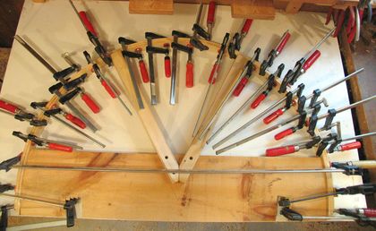 with the arch bent, I put on lots of clamps to make sure the four strips made good contact
