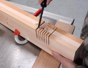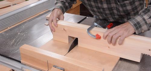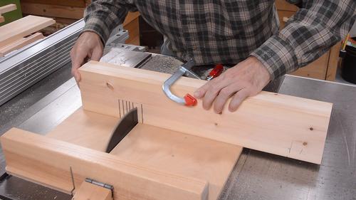 Note that I have all three boards that have these notches for the legs cut into them on the sled at once, held together with a clamp.