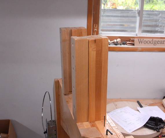 But if I make the L-bracket an integral part of the prongs, then I could make the whole prong deeper. I changed the front three layers to hardwood to make for a better sliding surface.