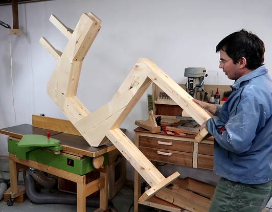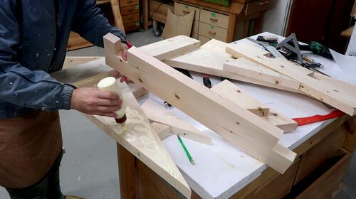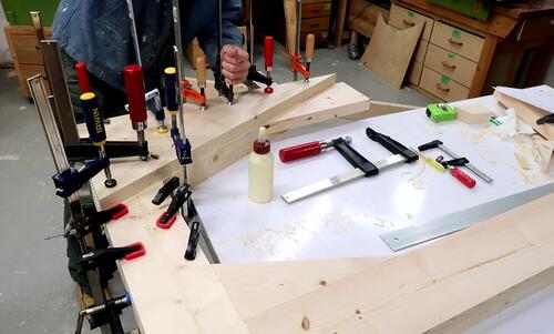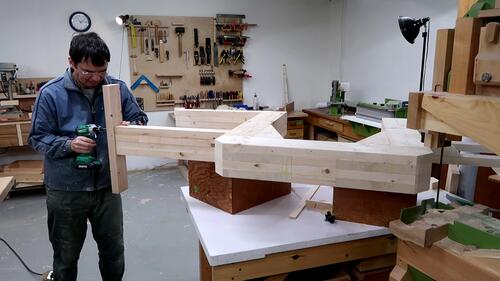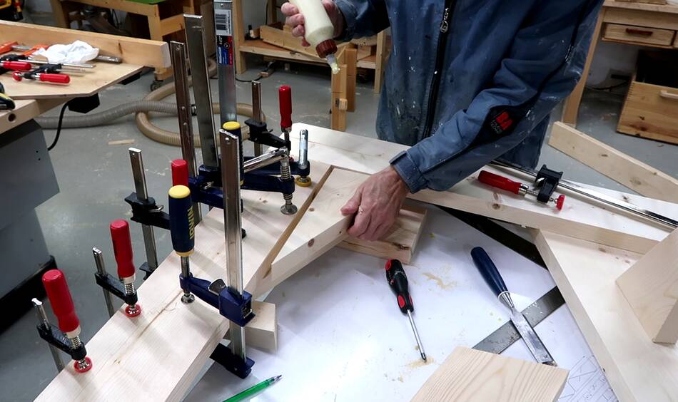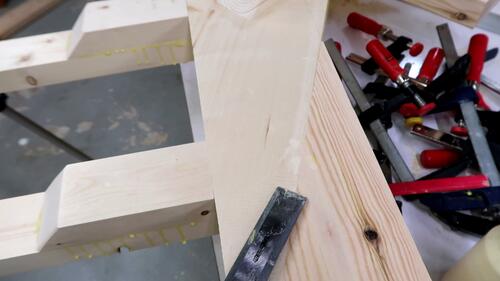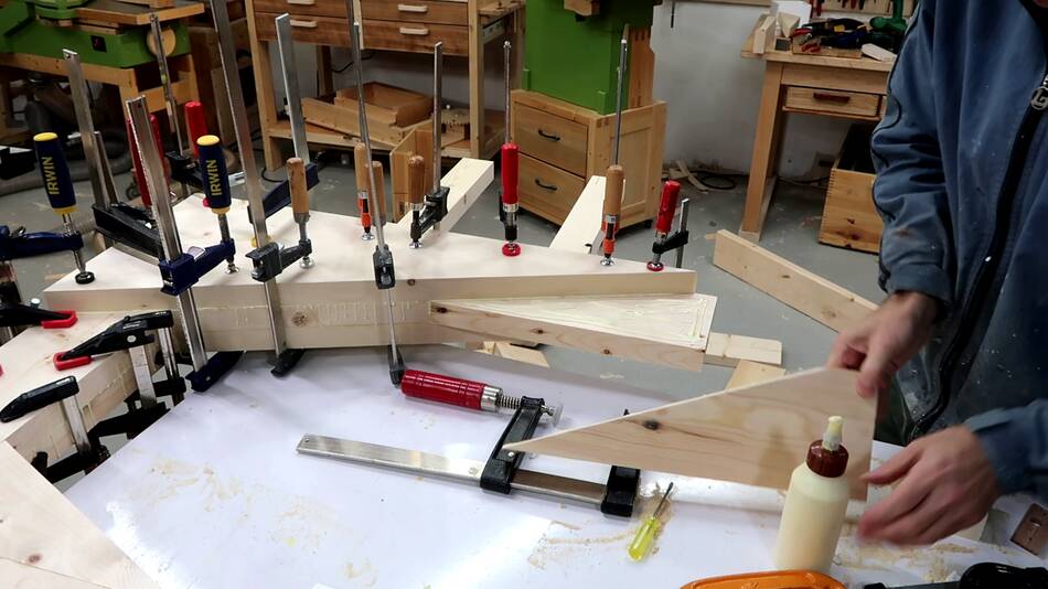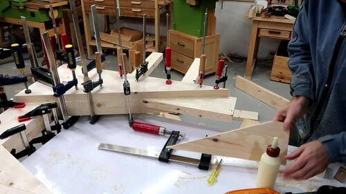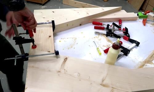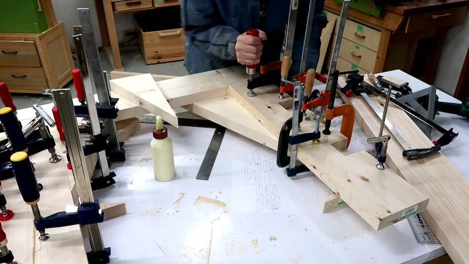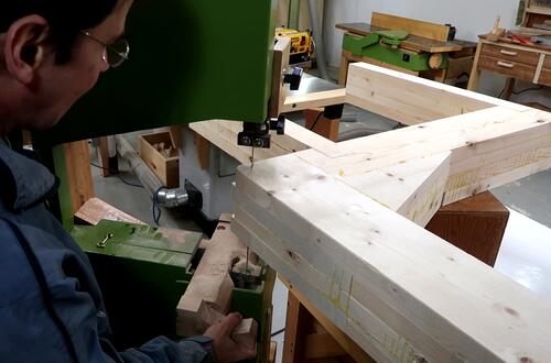 On my previous bandsaw builds I had small triangles as gussets between the horizontal and vertical beams, with alternate layers protruding about 3 cm into the post and the horizontal part to get a better joint. But with the layers twice as thick on this one, such a small overlap wouldn't be enough. So this time I decided to extend the triangle gussets all the way through the post and horizontal members to get more glue area. That makes the diagonally grained gusset the main structural member.