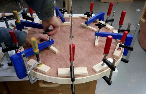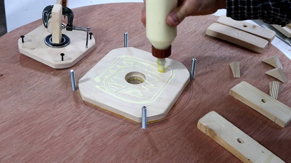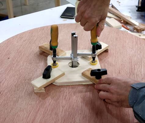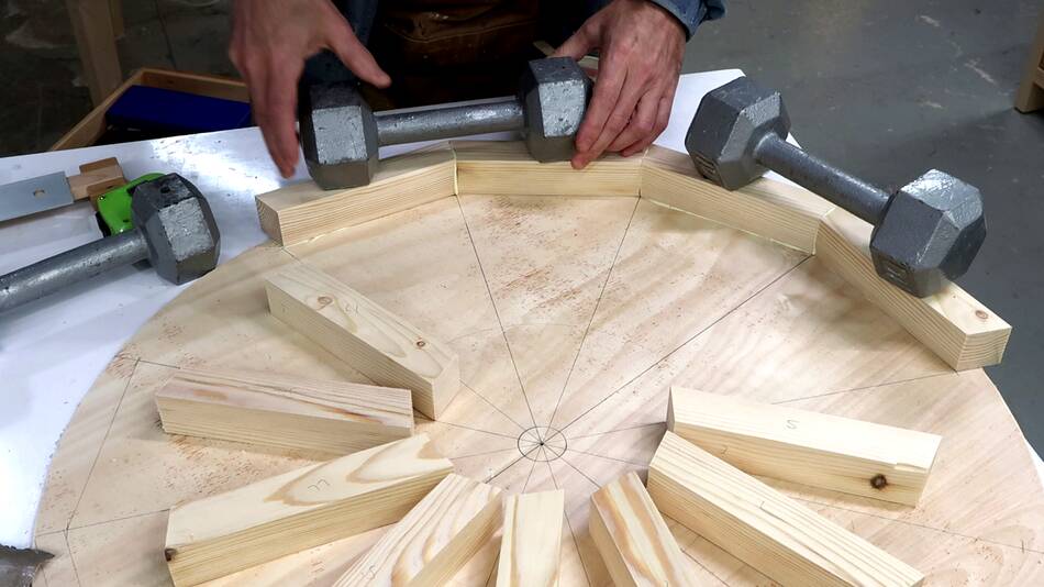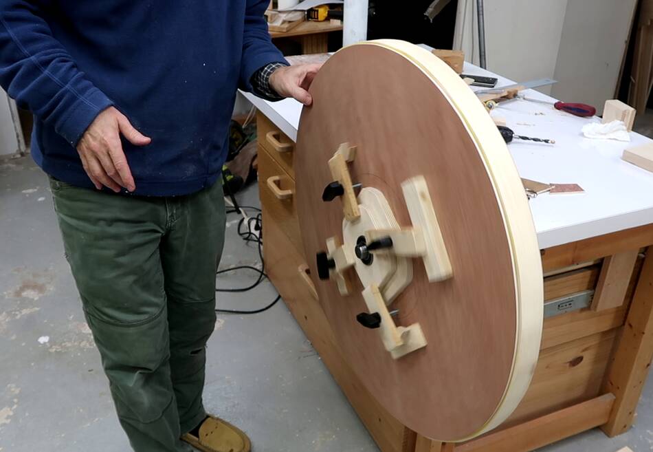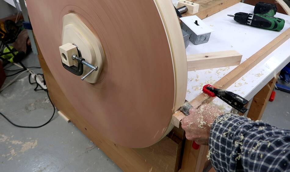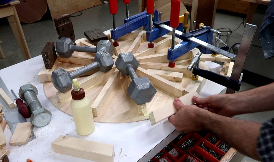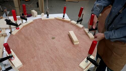 In retrospect, I could have drilled those four holes in the spokes through the top layer and put bolts through those holes to help clamp it. Also a bolt and a big washer through the center axle hole would also have helped clamp. Sand bags would also have been useful for the clamping.
