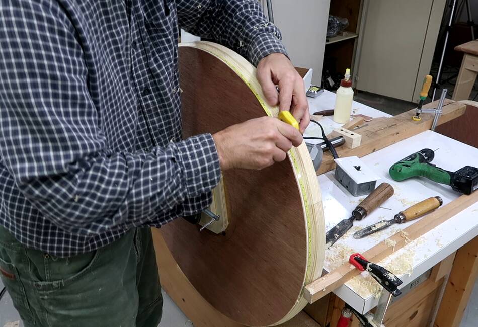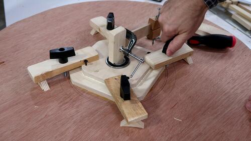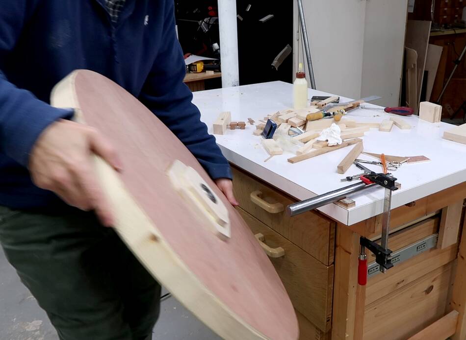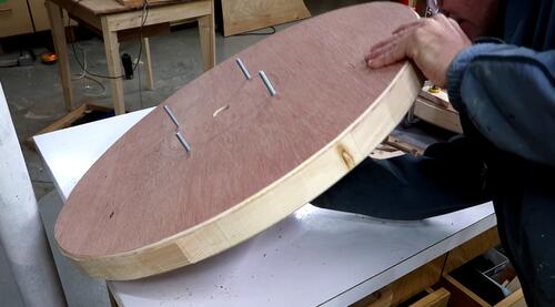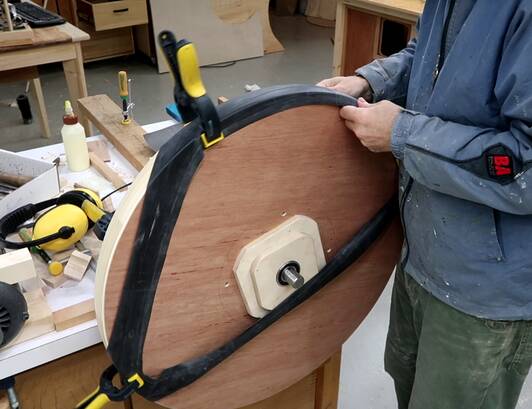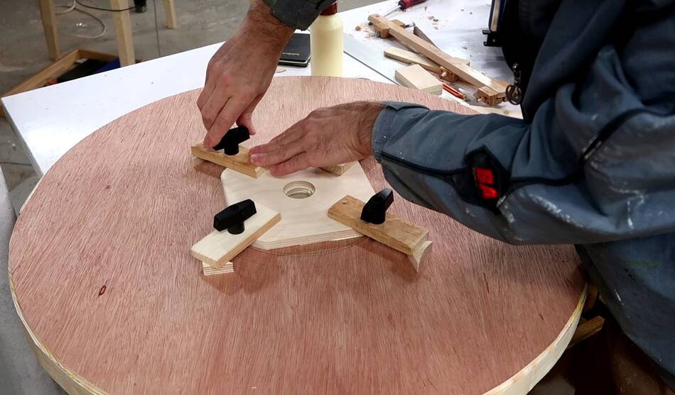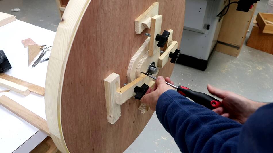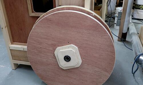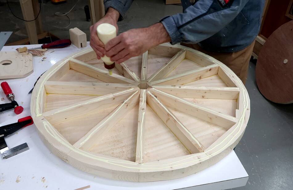 In retrospect, I could have drilled those four holes in the spokes through the top layer and put bolts through those holes to help clamp it. Also a bolt and a big washer through the center axle hole would also have helped clamp. Sand bags would also have been useful for the clamping.
