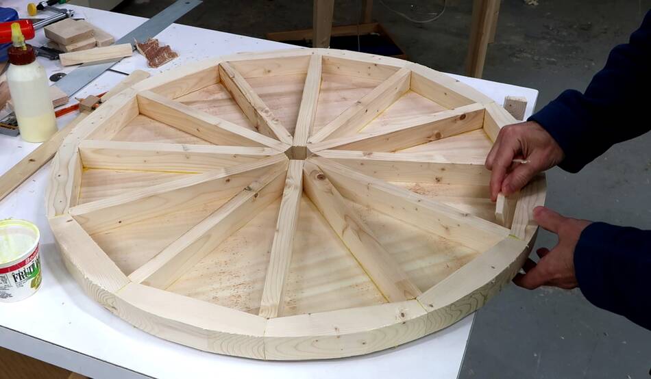 Every second spoke piece is pointy towards the middle to fit between the other spokes.